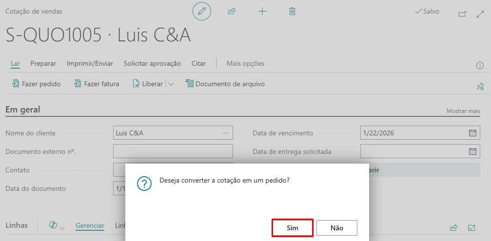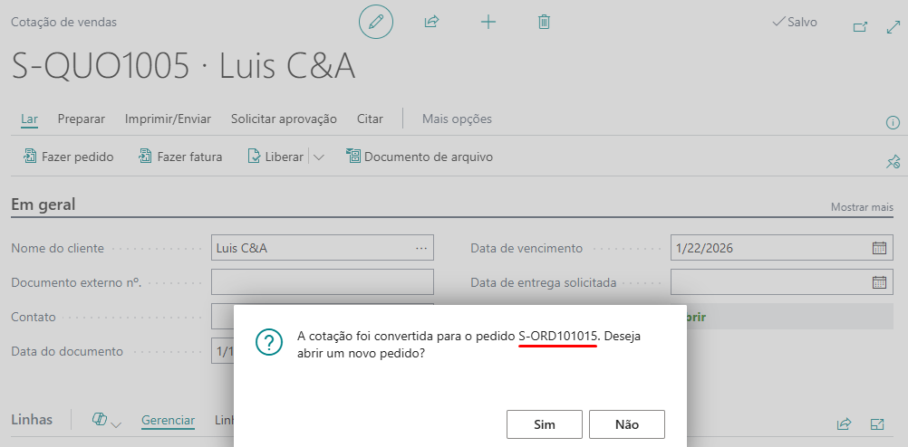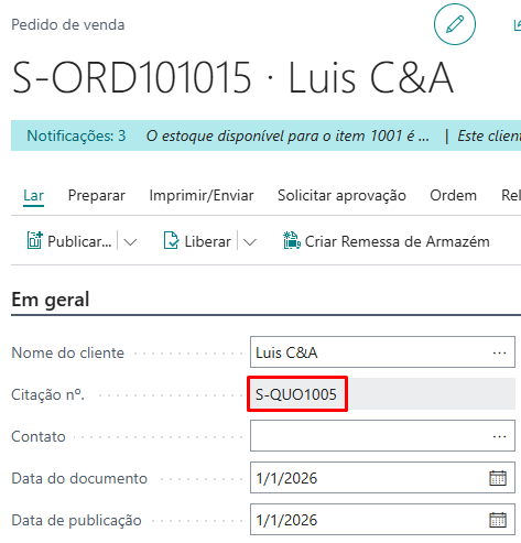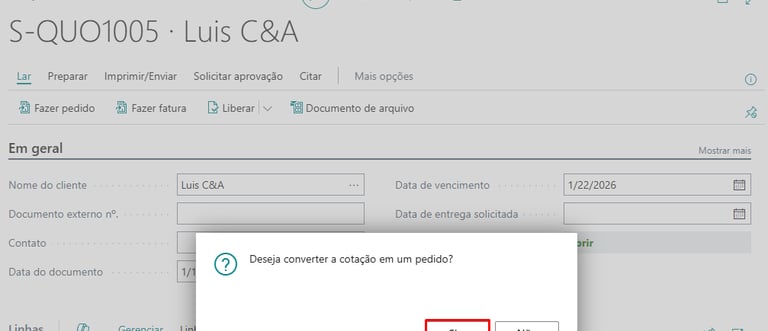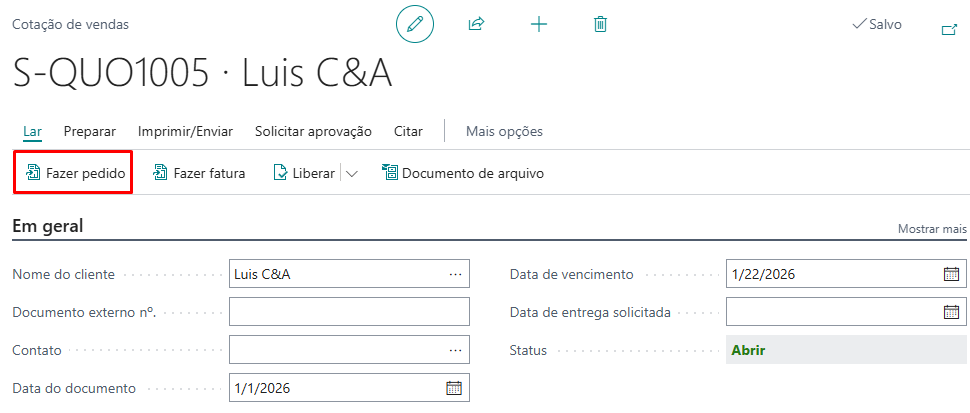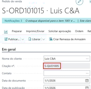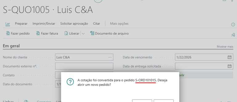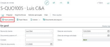 Como é de conhecimento geral, no Business Central, a Cotação de Venda é utilizada para registrar uma proposta comercial feita a um cliente ou potencial cliente, especificando os produtos, condições de entrega e formas de pagamento. Esta cotação pode ser enviada ao cliente como forma de formalizar a oferta. Após a aceitação por parte do cliente, a cotação pode ser convertida em uma Fatura de Venda ou em um Pedido de Venda, onde o processo de venda é efetivamente iniciado. Para isso, basta selecionar a ação “Make Order ou Fazer Pedido” na página da Cotação de Venda.